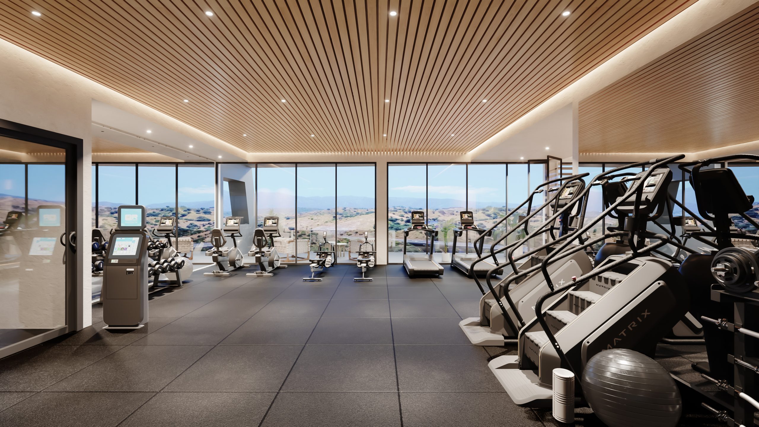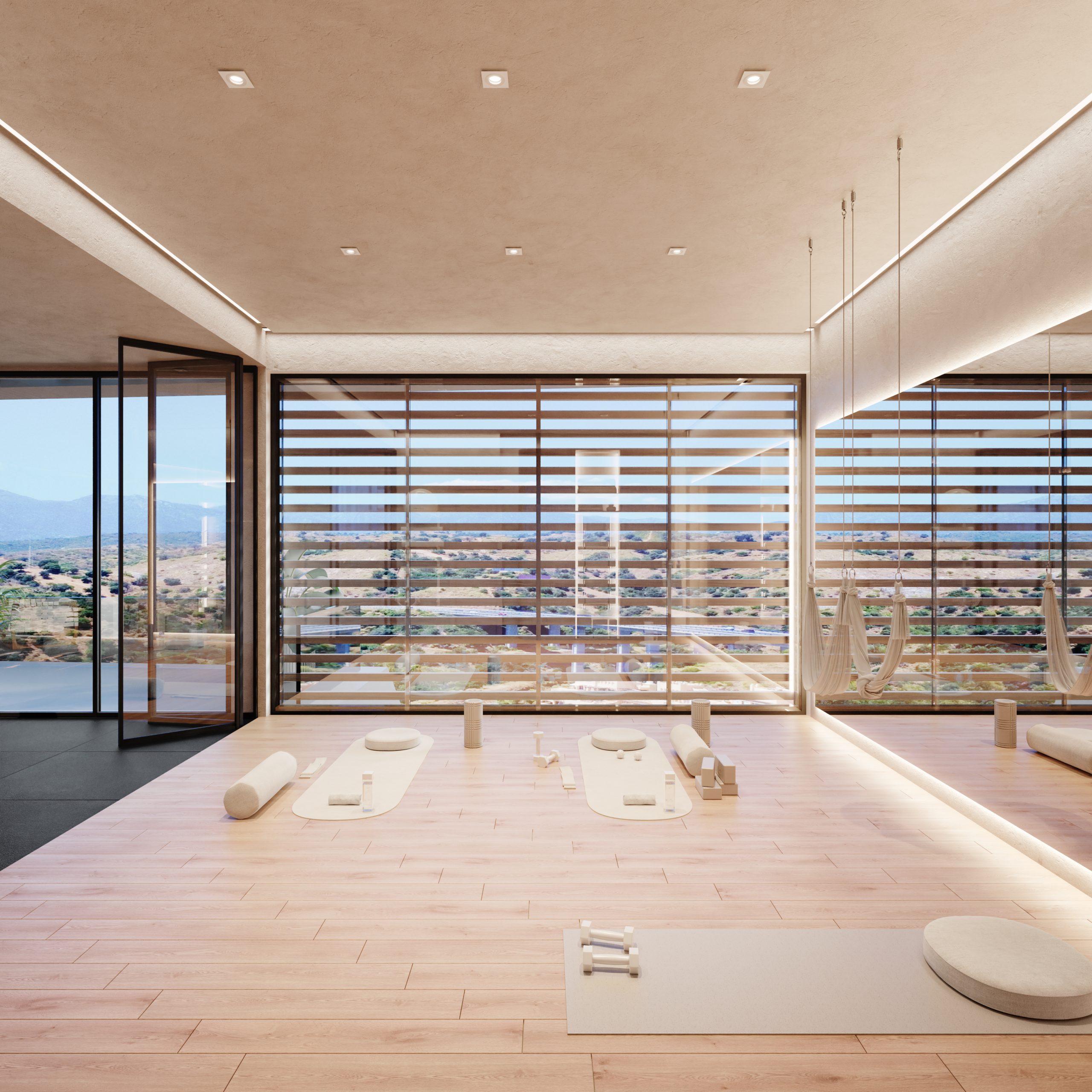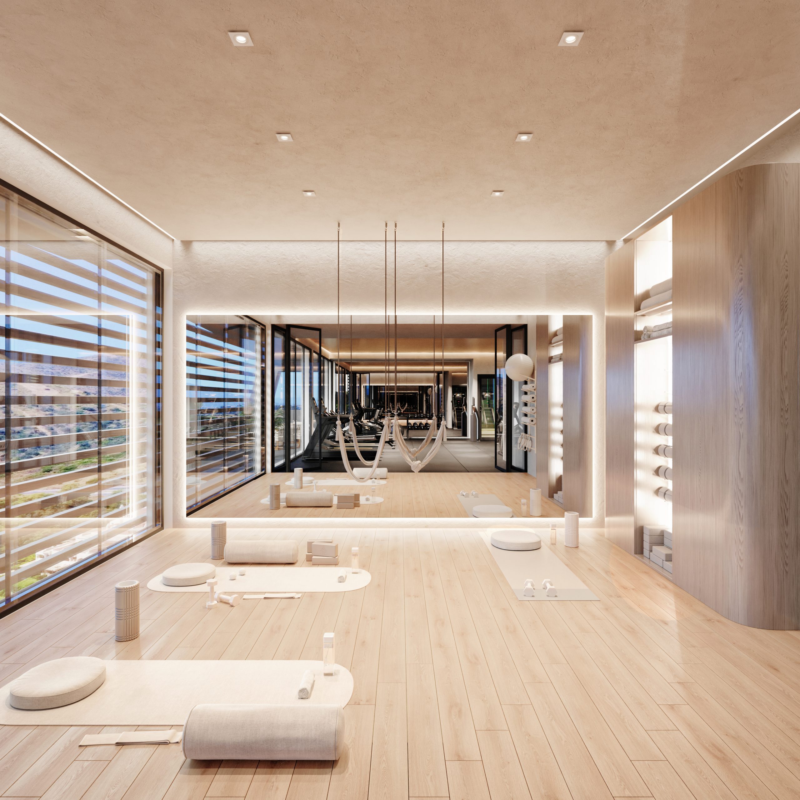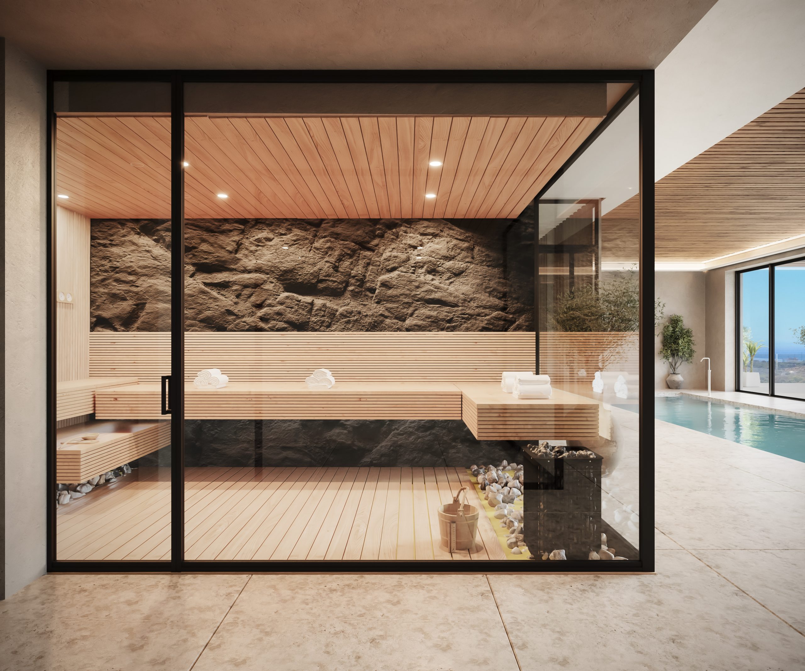 An expansive resort-standard common area has been designed on the estate, focusing on residents’ health, relaxation and physical activity. A wellness center with glass spaces and sea views is planned for the highest point of the plot, including an outdoor heated semi-Olympic type pool, a heated indoor pool, a fully equipped gym with a yoga and Pilates room, a sauna, a Turkish bath and a hydrotherapy area with ice buckets. There will also be a poolside bar with Balinese beds and five outdoor exercise zones: three outdoor yoga areas, an area combining yoga and calisthenics, and a separate Crossfit functional training zone. Rounding out the complex will be 24-hour security, access control, concierge service, and an in-house electrocar service to facilitate short rides to the beach, restaurants and nearby services.