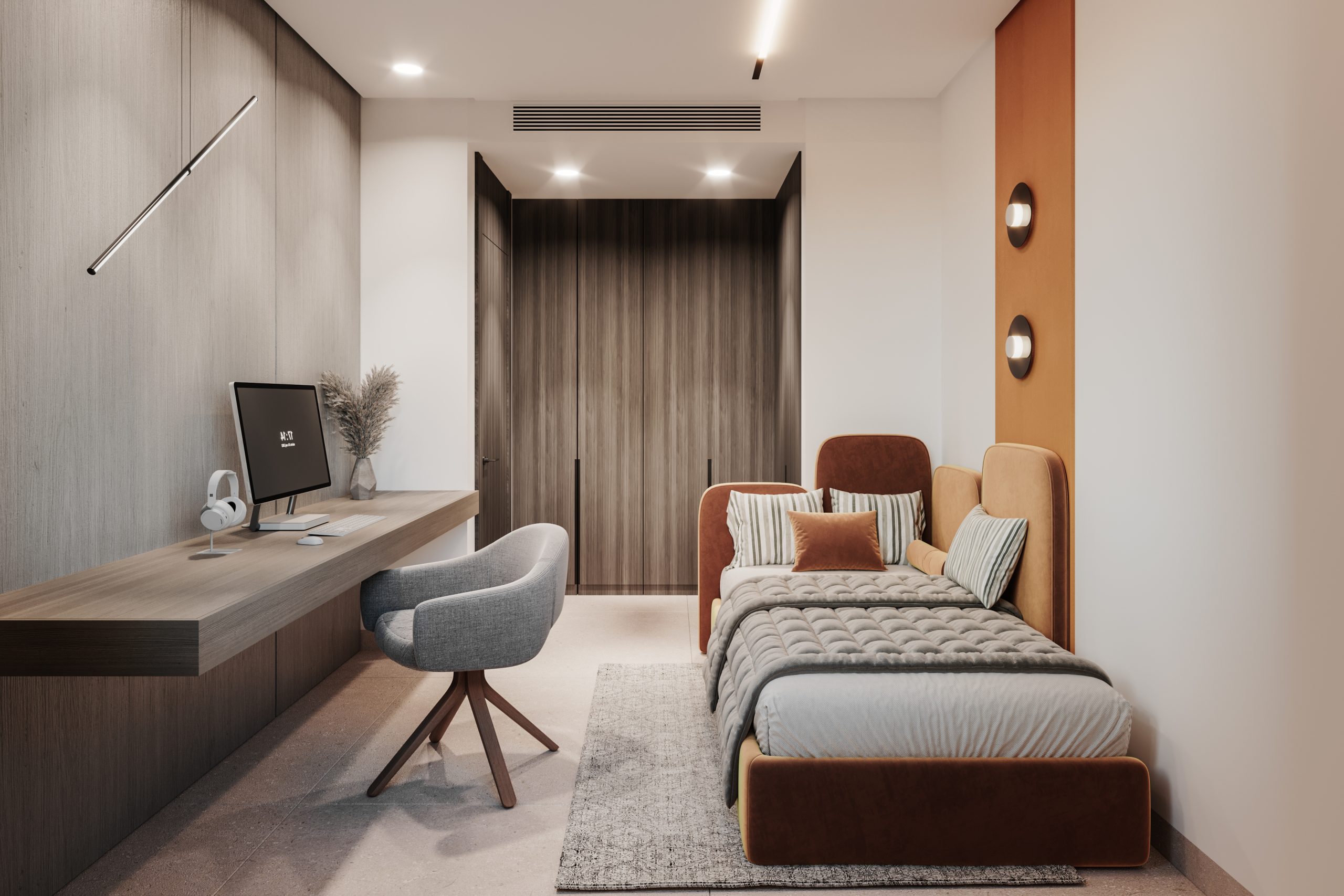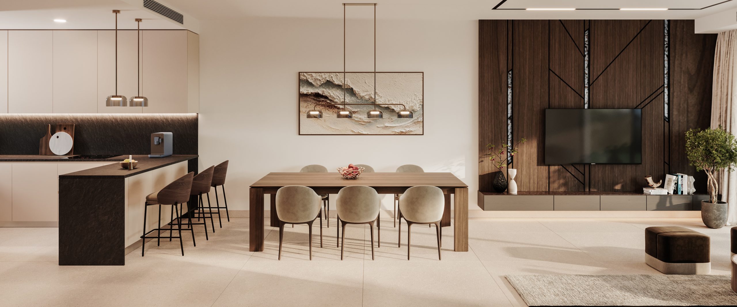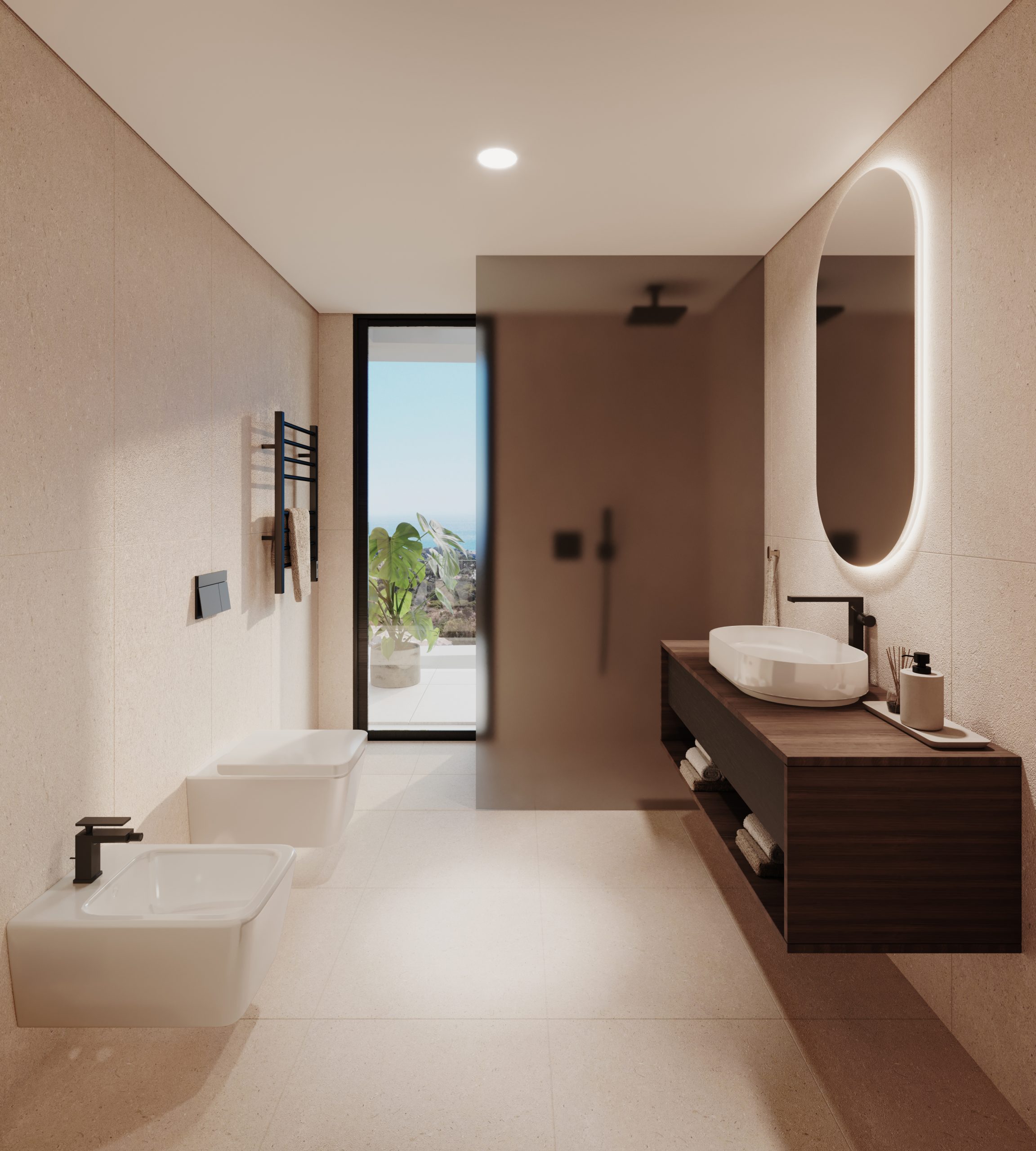 The finishing standard for the private parts implies contemporary, timeless interiors with calm colors, with an emphasis on natural materials and durable solutions. The living area provides for large-format Italian flooring and cladding, veneer kitchens and doors, and high-quality Siemens appliances with the option of selecting higher lines. The window joinery, with a high-insulation system, has been selected to maximize light in the interiors and open them to the terraces and garden. Bedrooms have been designed in warm, soft tones, with the possibility of arranging a work or reading area, while bathrooms feature Hansgrohe fixtures, large showers with glass enclosures, suspended toilets, light tonal stone cladding and illuminated mirrors.
